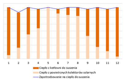 W naszym przypadku wykorzystanie ciepła z powietrznych kolektorów solarnych oraz kotłowni (rozdzielacza w kotłowni) w poszczególnych miesiącach może wyglądać następująco: