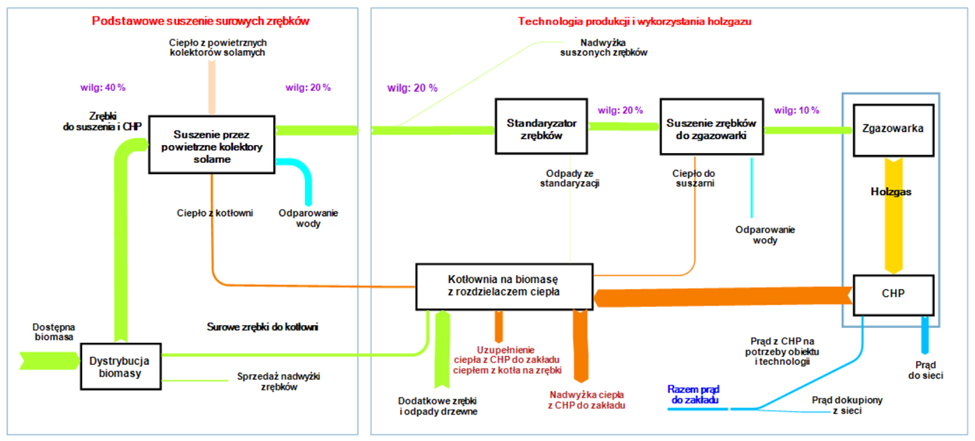 Bardzo ważną kwestią jest zdefiniowanie określenia „kotłownia”. Patrząc na powyższy schemat widzimy, że ciepło do suszenia określane jako „kotłownia” podawane jest z rozdzielacza ciepła, który jest zasilany z kotła zgazowującego oraz z agregatu kogeneracyjnego.