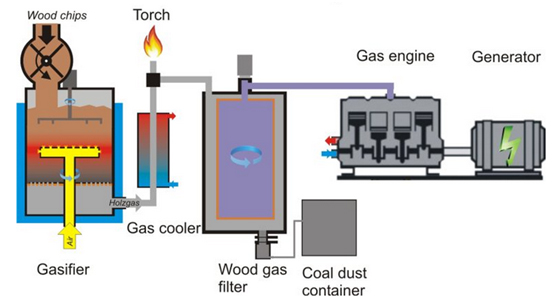 Wysuszone paliwo podawane jest do zgazowarki (nazywanej także gazogeneratorem), która wytwarza gaz drzewny (nazywany także syngaz lub holzgas).